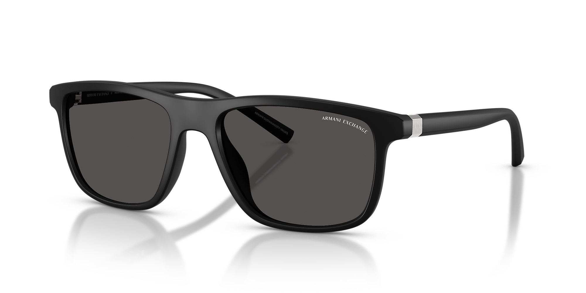 The Armani Exchange AX4167SU sunglasses deliver effortless cool with rectangular frames that combine clean lines and sleek design. Made from durable acetate with injected temples, they offer lasting comfort and style. The black frame front is paired with classic grey lenses for a refined look, while the universal fit ensures versatility. These black sunglasses for men feature a bold metal plaque reimagining the iconic A|X logo, adding a modern edge.