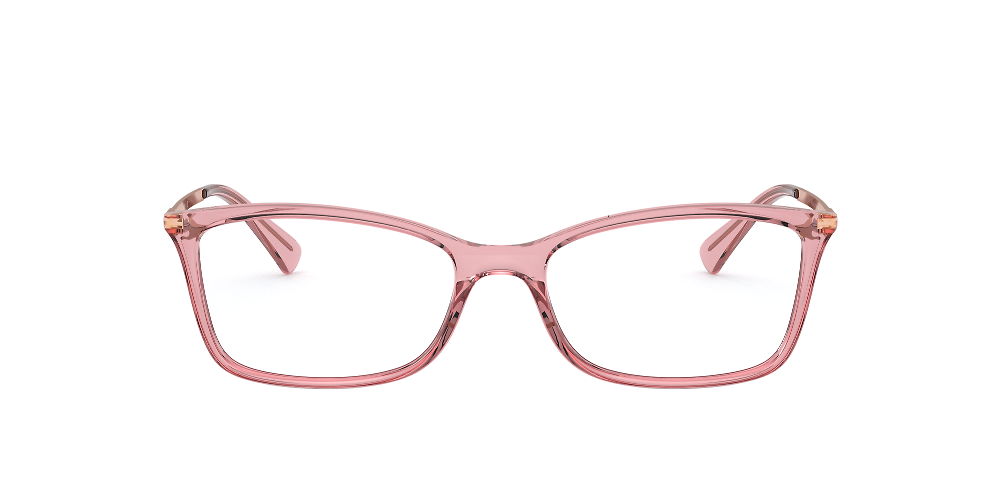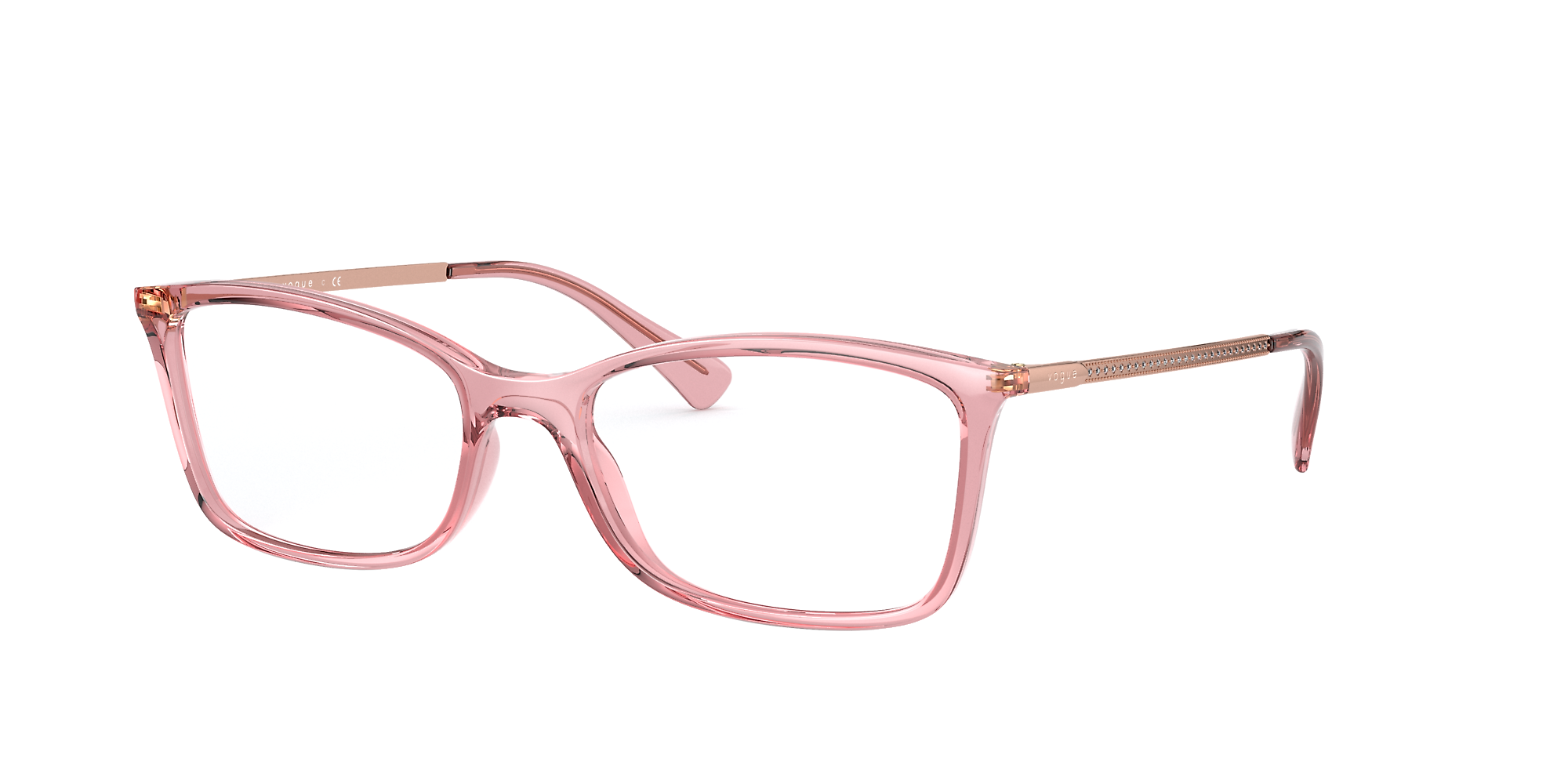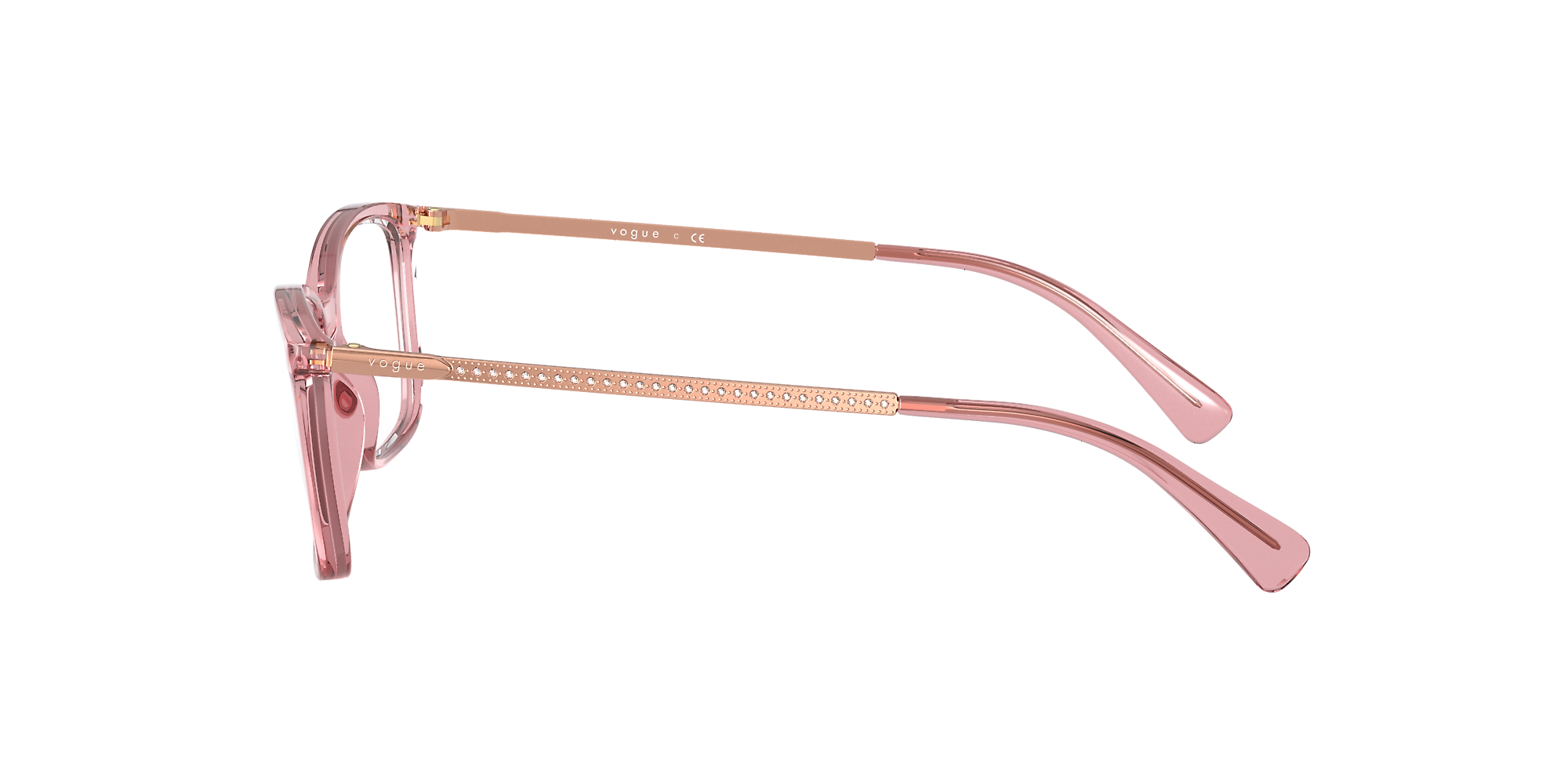 Elevate your eyewear fashion with Vogue Eyewear VO5305B. The polished transparent pink frame, in a unique pillow shape, is adorned with strass for an extra touch of glamour. With its saddle bridge design, these glasses offer a comfortable fit and a stylish look. These eyeglasses feature a timeless appeal that makes them perfect for everyday wear. Available with prescription lenses.