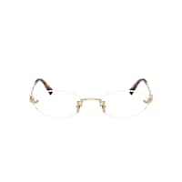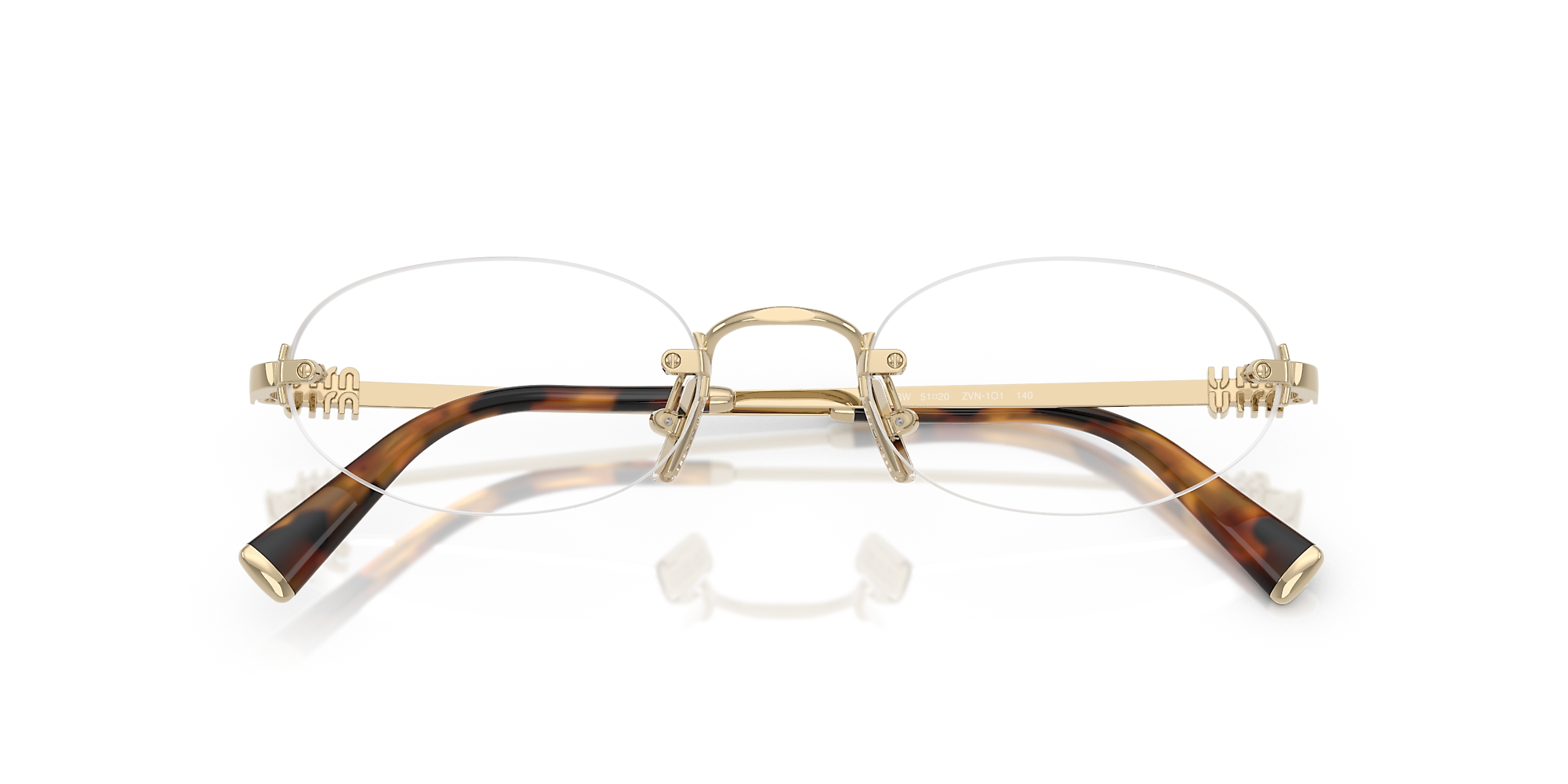 Elevate your fashion with Miu Miu MU 53WV eyeglasses. These oval-shaped frames are made of polished metal, offering durability and a touch of sophistication. The pale gold color adds a touch of elegance, making these glasses a versatile accessory for any outfit. Embrace your unique style with these statement-making frames. Available with prescription lenses.